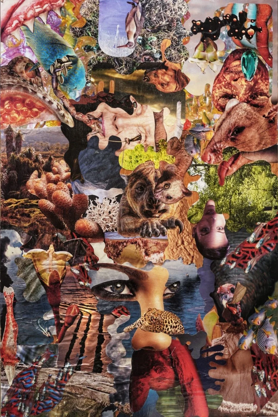 I make an analog collage and edit it using the digital method to evoke objective thoughts. During the exploration, I made a deconstructed human face surrounded by various wild birds. The streamlined liquid figure is interspersed in the picture to symbolize the carrier of my thinking.